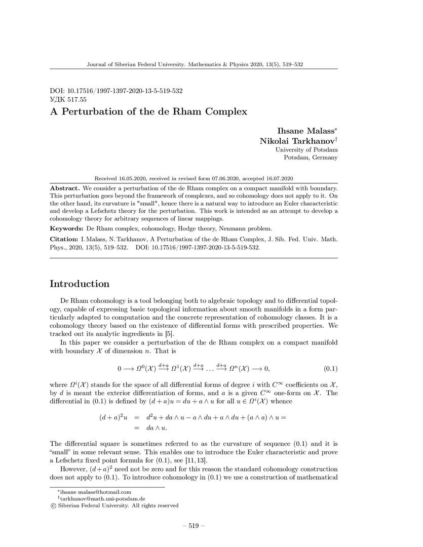 Библиографическое описание:Malass, Ihsane. A Perturbation of the de Rham Complex = Возмущение комплекса де Рама / I. Malass, N. Tarkhanov. - Текст : непосредственный // Журнал Сибирского федерального университета. Математика и физика. - 2020. - Т. 13, № 5. - С. 519–532. - Библиогр.: с. 531-532. - ISSN 1997-1397.