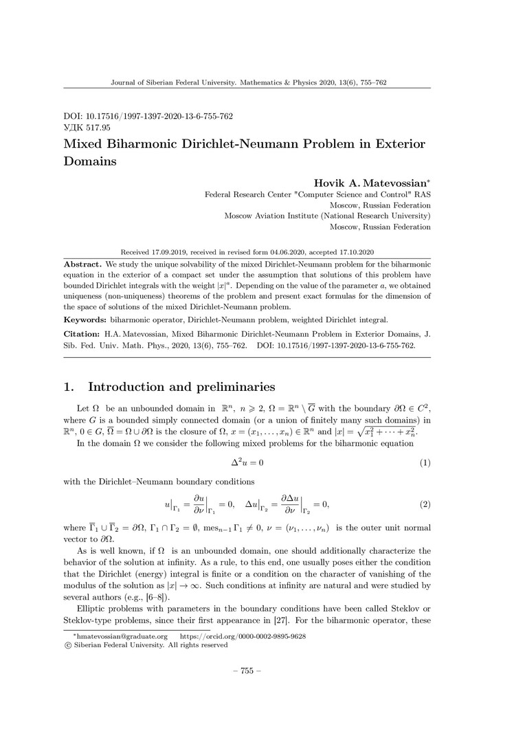 Библиографическое описание:Matevossian, Hovik. Mixed Biharmonic Dirichlet-Neumann Problem in Exterior Domains = Смешанная бигармоническая задача Дирихле–Неймана во внешних областях / H. A. Matevossian. - Текст : непосредственный // Журнал Сибирского федерального университета. Математика и физика. - 2020. - Т. 13, № 6. - С. 755-762. - Библиогр.: с. 760-761. - ISSN 1997-1397.
