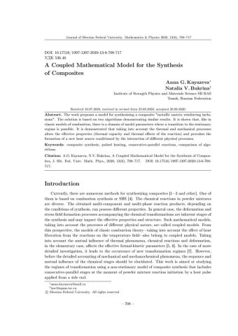 Библиографическое описание:Knyazeva, Anna. A Coupled Mathematical Model for the Synthesis of Composites = Связанная математическая модель синтеза композитов / A. G. Knyazeva, N. V. Bukrina. - Текст : непосредственный // Журнал Сибирского федерального университета. Математика и физика. - 2020. - Т. 13, № 6. - С. 708–717. - Библиогр.: с. 716-717. - ISSN 1997-1397.