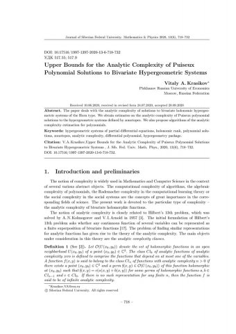 Библиографическое описание:Krasikov, Vitaly. Upper Bounds for the Analytic Complexity of Puiseux Polynomial Solutions to Bivariate Hypergeometric Systems = Верхние границы аналитической сложности решений двумерных гипергеометрических систем в классе многочленов Пюизо / V. A. Krasikov. - Текст : непосредственный // Журнал Сибирского федерального университета. Математика и физика. - 2020. - Т. 13, № 6. - С. 718–732. - Библиогр.: с. 731-732. - ISSN 1997-1397.