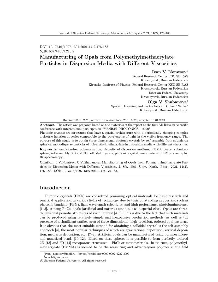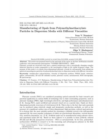 Библиографическое описание:Nemtsev, Ivan. Manufacturing of Opals from Polymethylmethacrylate Particles in Dispersion Media with Different Viscosities = Синтез опалов из частиц полиметилметакрилата в дисперсионных средах с различной вязкостью / I. V. Nemtsev, O. V. Shabanova. - Текст : непосредственный // Журнал Сибирского федерального университета. Математика и физика. - 2021. - Т. 14, № 2. - С. 176-183. - Библиогр.: с. 180-183. - ISSN 1997-1397.