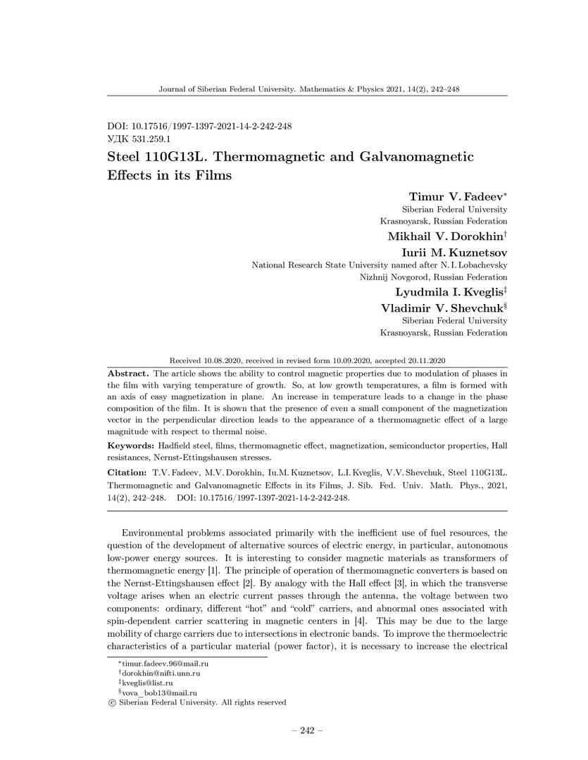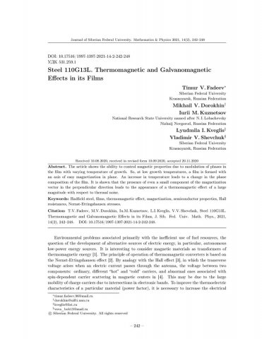 Библиографическое описание:Steel 110G13L. Thermomagnetic and Galvanomagnetic Effects in its Films = Сталь 110Г13Л. Термомагнитные и гальваномагнитные эффекты в ее пленках / T. V. Fadeev, M. V. Dorokhin, I. M. Kuznetsov [et al.]. - Текст : непосредственный // Журнал Сибирского федерального университета. Математика и физика. - 2021. - Т. 14, № 2. - С. 242-248. - Библиогр.: с. 247-248. - ISSN 1997-1397.