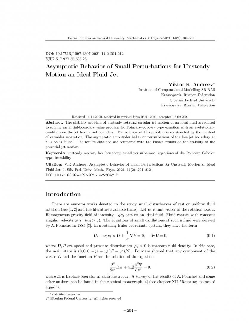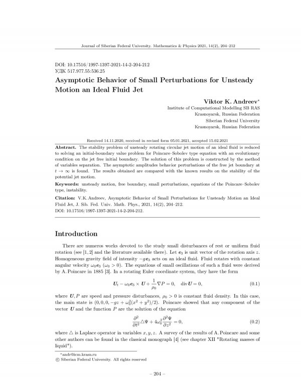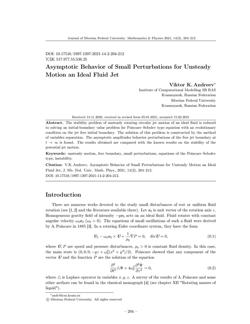 Библиографическое описание:Andreev, Viktor. Asymptotic Behavior of Small Perturbations for Unsteady Motion an Ideal Fluid Jet = Асимптотическое поведение малых возмущений нестационарного движения струи идеальной жидкости / V. K. Andreev. - Текст : непосредственный // Журнал Сибирского федерального университета. Математика и физика. - 2021. - Т. 14, № 2. - С. 204-212. - Библиогр.: с. 211-212. - ISSN 1997-1397.