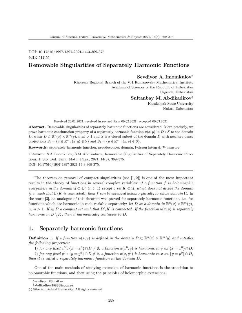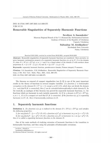 Библиографическое описание:Imomkulov, Sevdiyor A... Removable Singularities of Separately Harmonic Functions = Стираемые особенности сепаратно-гармонических функций / S. A. Imomkulov, S. M. Abdikadirov. - Текст : непосредственный // Журнал Сибирского федерального университета. Математика и физика. - 2021. - Т. 14, № 3. - С. 369-375. - Библиогр.: с. 374-375. - ISSN 1997-1397.