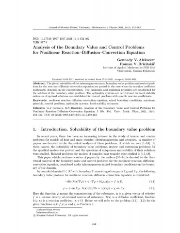 Библиографическое описание:Alekseev, Gennady. Analysis of the Boundary Value and Control Problems for Nonlinear Reaction–Diffusion–Convection Equation = Анализ краевых задач и задач управления для нелинейного уравнения реакции-диффузии-конвекции / G. V. Alekseev, R. V. Brizitskii. - Текст : непосредственный // Журнал Сибирского федерального университета. Математика и физика. - 2021. - Т. 14, № 4. - С. 452-462. - Библиогр.: с. 461-462. - ISSN 1997-1397.