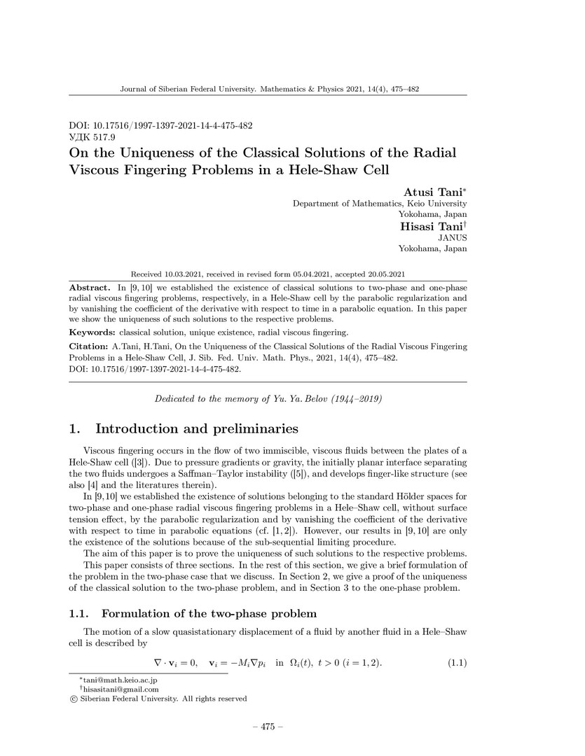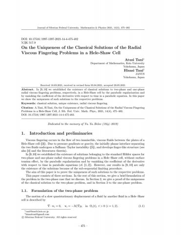 Библиографическое описание:Atusi Tani. On the Uniqueness of the Classical Solutions of the Radial Viscous Fingering Problems in a Hele-Shaw Cell = О единственности классических решений задач радиальной вязкой пальцеобразной структуры в ячейке Хеле-Шоу / Atusi Tani, Hisasi Tani. - Текст : непосредственный // Журнал Сибирского федерального университета. Математика и физика. - 2021. - Т. 14, № 4. - С. 475-482. - Библиогр.: с. 482. - ISSN 1997-1397.