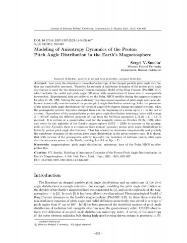Библиографическое описание:Smolin, Sergei. Modeling of Anisotropy Dynamics of the Proton Pitch Angle Distribution in the Earth’s Magnetosphere = Моделирование динамики анизотропии питч-углового распределения протонов в магнитосфере Земли / S. V. Smolin. - Текст : непосредственный // Журнал Сибирского федерального университета. Математика и физика. - 2021. - Т. 14, № 5. - С. 632-637. - Библиогр.: с. 636-637. - ISSN 1997-1397.