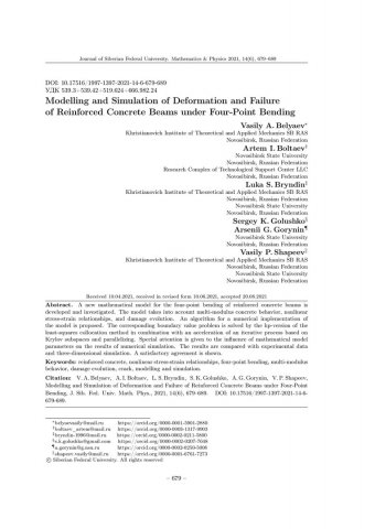 Библиографическое описание:Modelling and Simulation of Deformation and Failure of Reinforced Concrete Beams under Four-Point Bending = Моделирование деформирования и разрушения железобетонных балок при четырехточечном изгибе / V. A. Belyaev, A. I. Boltaev, L. S. Bryndin [et al.]. - Текст : непосредственный // Журнал Сибирского федерального университета. Математика и физика. - 2021. - Т. 14, № 6. - С. 679-689. - Библиогр.: с. 688-689. - ISSN 1997-1397.