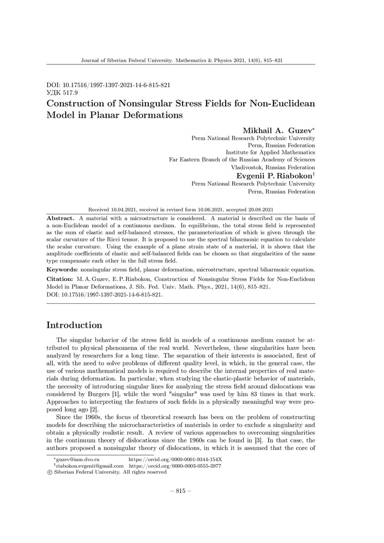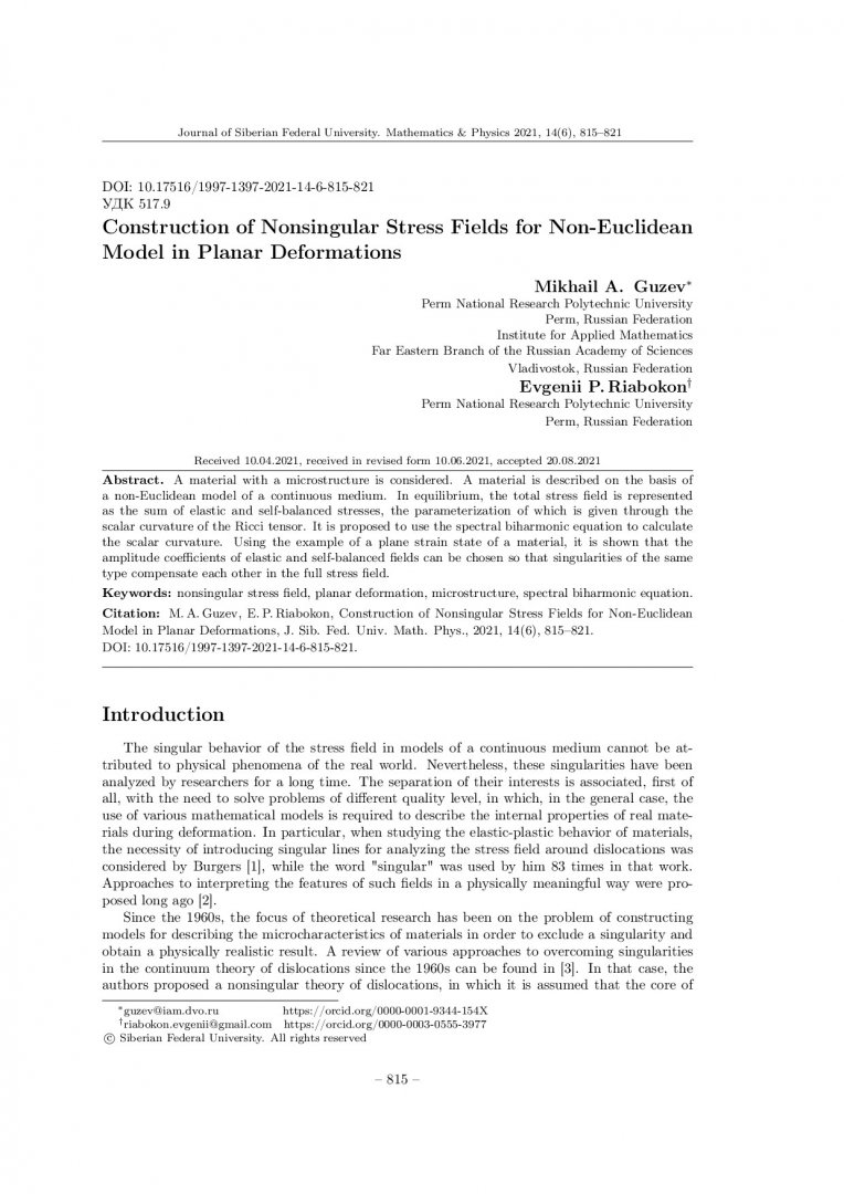 Библиографическое описание:Guzev, Mikhail. Construction of Nonsingular Stress Fields for Non-Euclidean Model in Planar Deformations = Построение несингулярных полей напряжений в неевклидовой модели для плоско-деформированного состояния сплошной среды / M. A. Guzev, E. P. Riabokon. - Текст : непосредственный // Журнал Сибирского федерального университета. Математика и физика. - 2021. - Т. 14, № 6. - С. 815-821. - Библиогр.: с. 819-821. - ISSN 1997-1397.