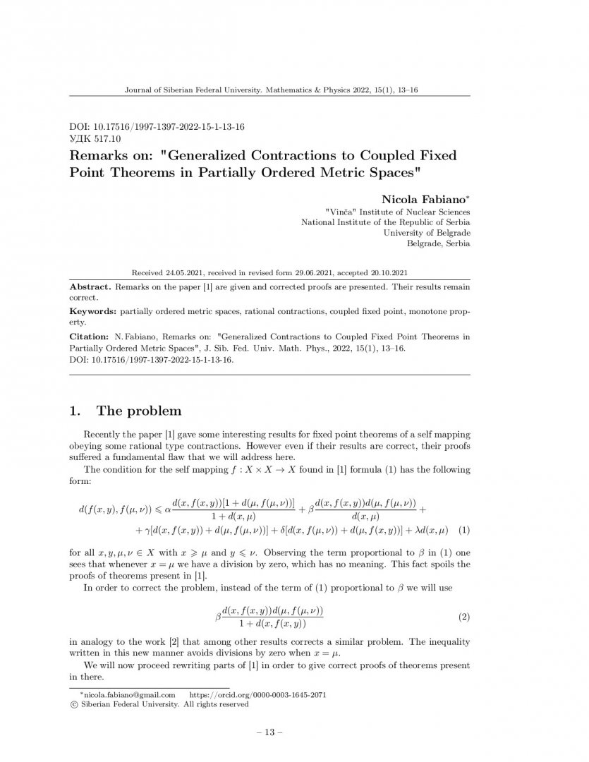 Библиографическое описание:Fabiano, Nicola. Remarks on: "Generalized Contractions to Coupled Fixed Point Theorems in Partially Ordered Metric Spaces" = Замечания по статье: "Обобщенные сжатия теорем о связанных неподвижных точках в частично упорядоченных метрических пространствах" / Nicola Fabiano. - Текст : непосредственный // Журнал Сибирского федерального университета. Математика и физика. - 2022. - Т. 15, № 1. - С. 13-16. - Библиогр.: с. 16. - ISSN 1997-1397.