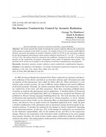 Библиографическое описание:Shaidurov, Georgy. On Seawater Conductivity Control by Acoustic Radiation = Об управлении проводимостью морской воды акустическим излучением / G. Ya. Shaidurov, D. S. Kudinov, A. N. Fomin. - Текст : непосредственный // Журнал Сибирского федерального университета. Математика и физика. - 2022. - Т. 15, № 1. - С. 101-107. - Библиогр.: с. 105-107. - ISSN 1997-1397.