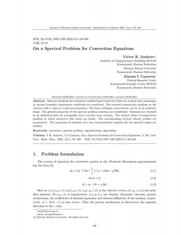 Библиографическое описание:Andreev, Victor. On a Spectral Problem for Convection Equations = Об одной спектральной задаче для уравнений конвекции / V. K. Andreev, A. I. Uporova. - Текст : непосредственный // Журнал Сибирского федерального университета. Математика и физика. - 2022. - Т. 15, № 1. - С. 88-100. - Библиогр.: с. 99-100. - ISSN 1997-1397.