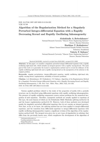 Библиографическое описание:Bobodzhanov, Abdukhafiz. Algorithm of the Regularization Method for a Singularly Perturbed Integro-differential Equation with a Rapidly Decreasing Kernel and Rapidly Oscillating Inhomogeneity = Алгоритм метода регуляризации для сингулярно возмущенного интегро-дифференциального уравнения с быстро убывающим ядром и с быстро осциллирующей неоднородностью / A. A. Bobodzhanov, B. T. Kalimbetov, V. F. Safonov. - Текст : непосредственный // Журнал Сибирского федерального университета. Математика и физика. - 2022. - Т. 15, № 2. - С. 214-223. - Библиогр.: с. 222-223. - ISSN 1997-1397.