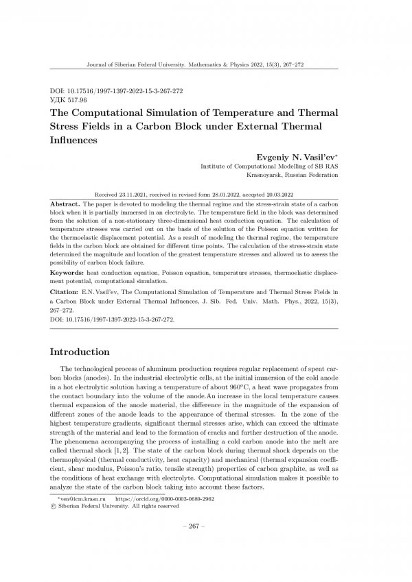 Библиографическое описание:Vasil`ev, Evgeniy. The Computational Simulation of Temperature and Thermal Stress Fields in a Carbon Block under External Thermal Influences = Вычислительное моделирование полей температур и термических напряжений в угольном блоке при внешних тепловых воздействиях / Evgeniy N Vasil’ev. - Текст : непосредственный // Журнал Сибирского федерального университета. Математика и физика. - 2022. - Т. 15, № 3. - С. 267-272. - Библиогр.: с. 271-272. - ISSN 1997-1397.
