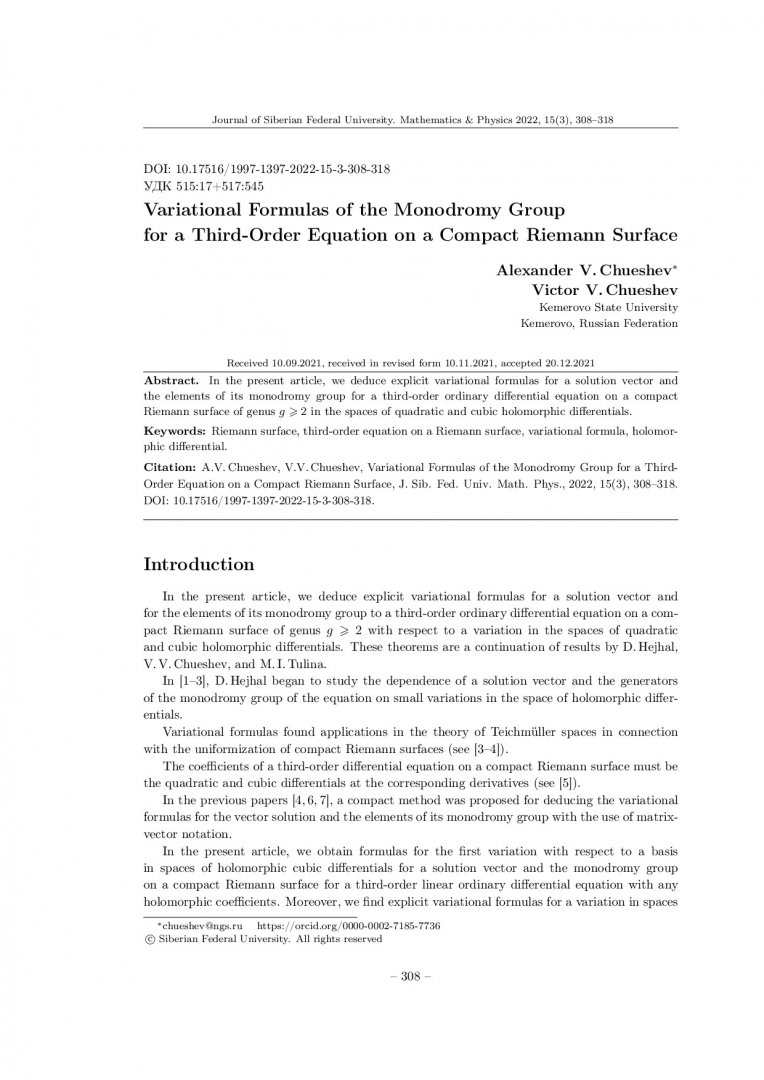 Библиографическое описание:Chueshev, Alexander. Variational Formulas of the Monodromy Group for a Third-Order Equation on a Compact Riemann Surface = Вариационные формулы группы монодромии для уравнения третьего порядка на компактной римановой поверхности / A. V. Chueshev, V. V. Chueshev. - Текст : непосредственный // Журнал Сибирского федерального университета. Математика и физика. - 2022. - Т. 15, № 3. - С. 308-318. - Библиогр.: с. 318. - ISSN 1997-1397.