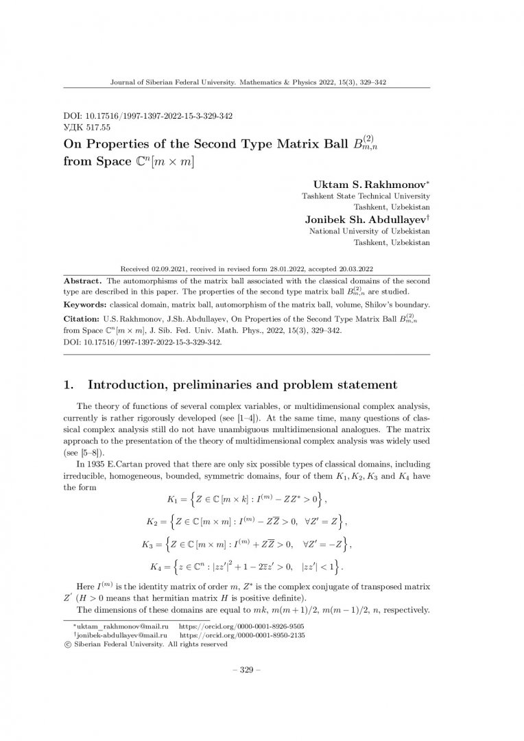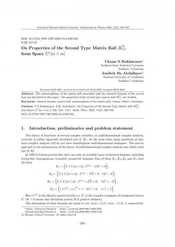 Библиографическое описание:Rakhmonov, Uktam. On Properties of the Second Type Matrix Ball B(2) m;n from Space Cn[m x m] = О свойствах матричного шара второго типа B(2) m;n из пространства Cn[m х m] / U. S. Rakhmonov, J. Sh. Abdullayev. - Текст : непосредственный // Журнал Сибирского федерального университета. Математика и физика. - 2022. - Т. 15, № 3. - С. 329-342. - Библиогр.: с. 340-342. - ISSN 1997-1397.