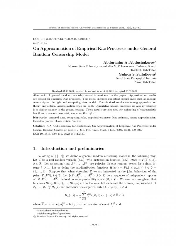 Библиографическое описание:Abdushukurov, Abdurahim. On Approximation of Empirical Kac Processes under General Random Censorship Model = Об аппроксимации эмпирических процессов Каца в общей модели случайного цензурирования / A. A. Abdushukurov, G. S. Saifulloeva. - Текст : непосредственный // Журнал Сибирского федерального университета. Математика и физика. - 2022. - Т. 15, № 3. - С. 292-307. - Библиогр.: с. 306-307. - ISSN 1997-1397.