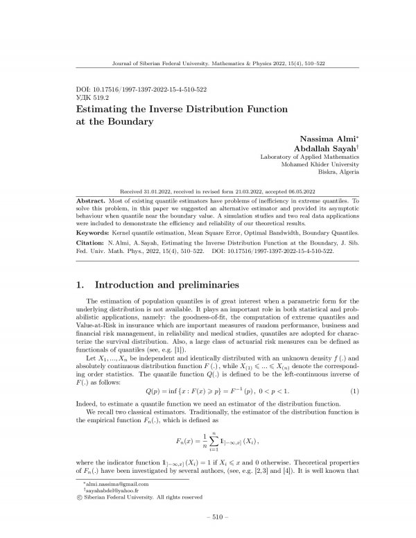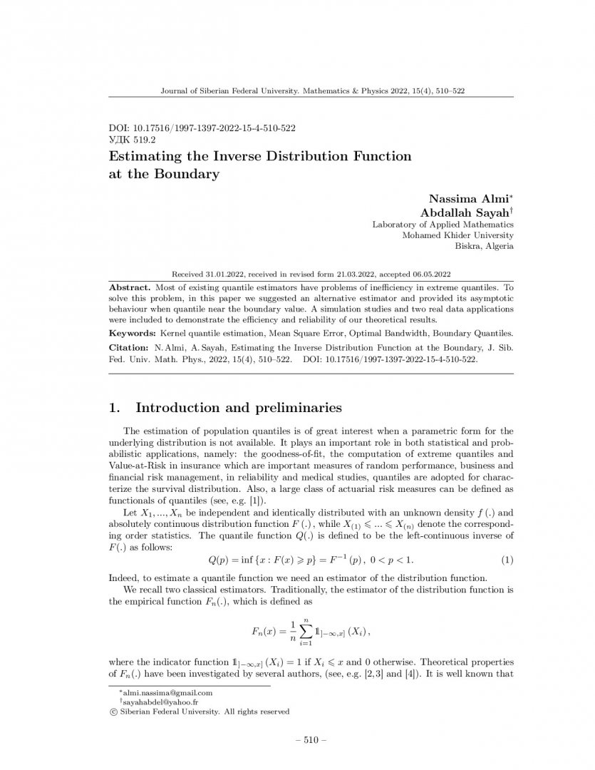 Библиографическое описание:Nassima Almi. Estimating the Inverse Distribution Function at the Boundary = Оценка обратной функции распределения на границе / Nassima Almi, Abdallah Sayah. - Текст : непосредственный // Журнал Сибирского федерального университета. Математика и физика. - 2022. - Т. 15, № 4. - С. 510-522. - Библиогр.: с. 520-522. - ISSN 1997-1397.