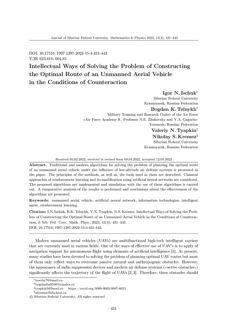 Библиографическое описание:Intellectual Ways of Solving the Problem of Constructing the Optimal Route of an Unmanned Aerial Vehicle in the Conditions of Counteraction = Интеллектуальные подходы к решению задачи построения оптимального маршрута беспилотного летательного аппарата в условиях противодействия / I. N. Ischuk, B. K. Telnykh, V. N. Tyapkin, N. S. Kremez. - Текст : непосредственный // Журнал Сибирского федерального университета. Математика и физика. - 2022. - Т. 15, № 4. - С. 431-443. - Библиогр.: с. 442-443. - ISSN 1997-1397.