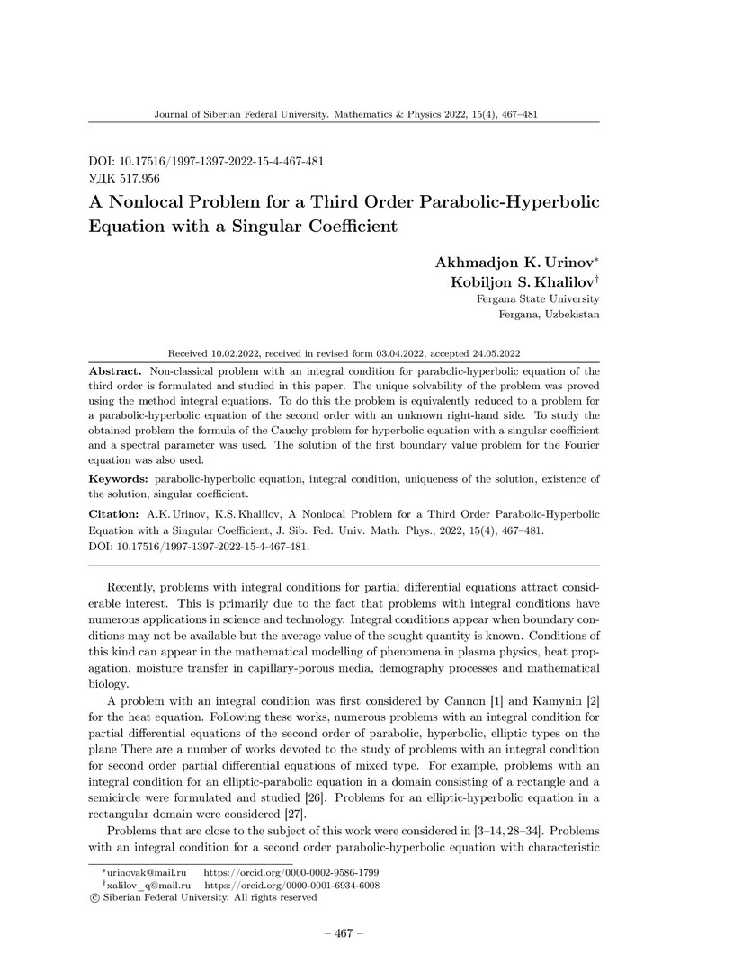 Библиографическое описание:Urinov, Akhmadjon. A Nonlocal Problem for a Third Order Parabolic-Hyperbolic Equation with a Singular Coefficient = Нелокальная задача для одного параболо-гиперболического уравнения третьего порядка с сингулярным коэффициентом / A. K. Urinov, K. S. Khalilov. - Текст : непосредственный // Журнал Сибирского федерального университета. Математика и физика. - 2022. - Т. 15, № 4. - С. 467-481. - Библиогр.: с. 478-481. - ISSN 1997-1397.