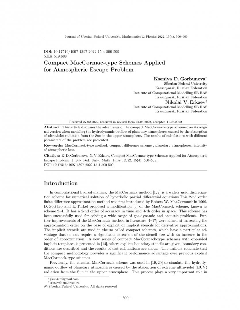 Библиографическое описание:Gorbunova, Kseniya. Compact MacCormac-type Schemes Applied for Atmospheric Escape Problem = Применение компактных разностных схем для задач гидродинамического истечения атмосфер планет / K. D. Gorbunova, N. V. Erkaev. - Текст : непосредственный // Журнал Сибирского федерального университета. Математика и физика. - 2022. - Т. 15, № 4. - С. 500-509. - Библиогр.: с. 508-509. - ISSN 1997-1397.
