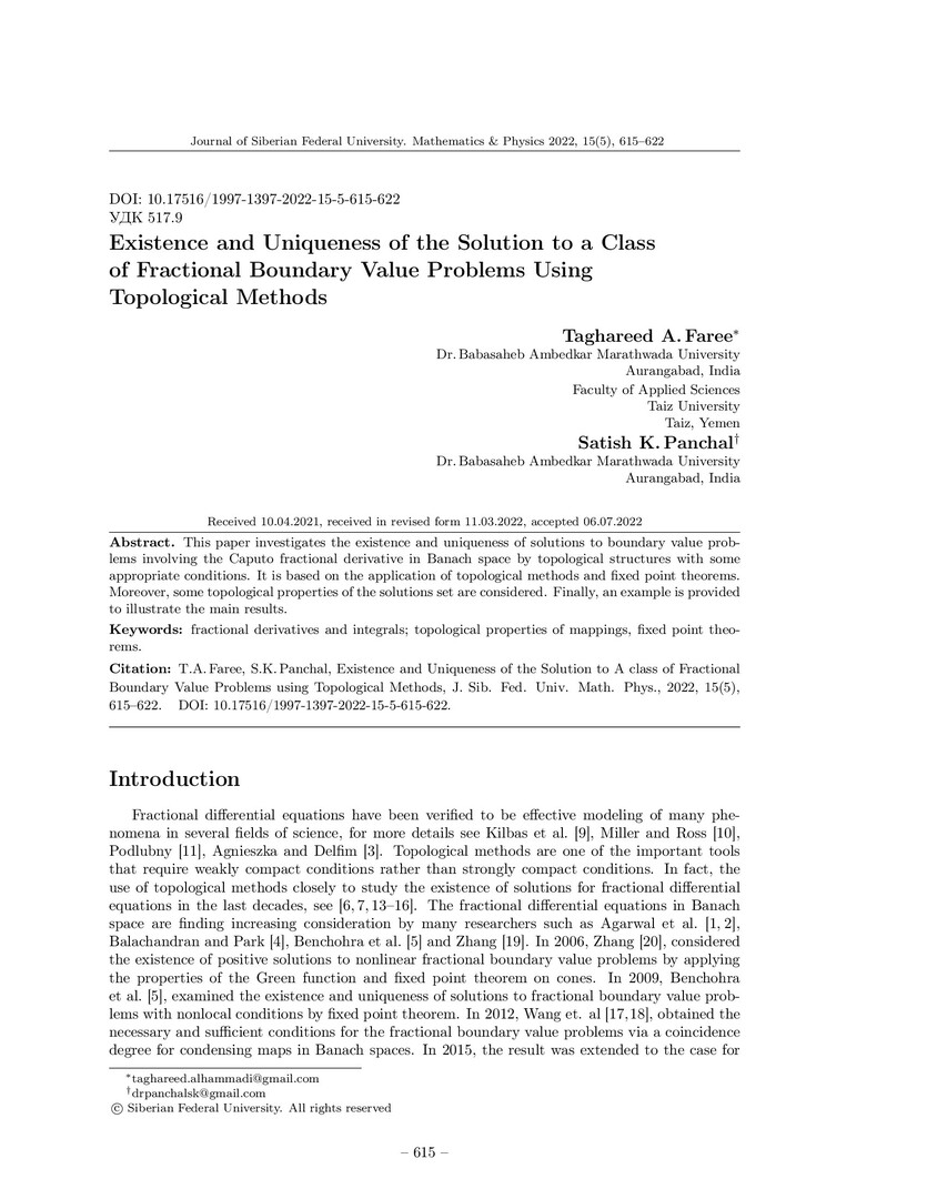 Библиографическое описание:Faree, Taghareed. Existence and Uniqueness of the Solution to a Class of Fractional Boundary Value Problems Using Topological Methods = Существование и единственность решений краевых задач с дробной производной с помощью топологических структур / T. A. Faree, S. K. Panchal. - Текст : непосредственный // Журнал Сибирского федерального университета. Математика и физика. - 2022. - Т. 15, № 5. - С. 615-622. - Библиогр.: с. 621-622. - ISSN 1997-1397.