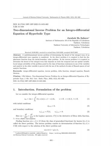 Библиографическое описание:Safarov, Jurabek. Two-dimensional Inverse Problem for an Integro-differential Equation of Hyperbolic Type = Двумерная обратная задача для интегро-дифференциального уравнения гиперболического типа / Jurabek Sh. Safarov. - Текст : непосредственный // Журнал Сибирского федерального университета. Математика и физика. - 2022. - Т. 15, № 5. - С. 651-662. - Библиогр.: с. 661-662. - ISSN 1997-1397.