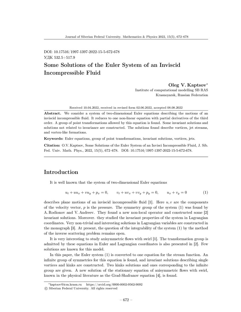 Аннотация:В работе изучается система двумерных уравнений Эйлера, описывающая движения невязкой несжимаемой жидкости. Она сводится к одному нелинейному уравнению с частными производными третьего порядка. Найдена группа точечных преобразований, допускаемых этим уравнением. Построены некоторые инвариантные решения и решения не связанные с инвариантностью. Найденные решения описывают вихри, струйные течения и вихреподобные образования.