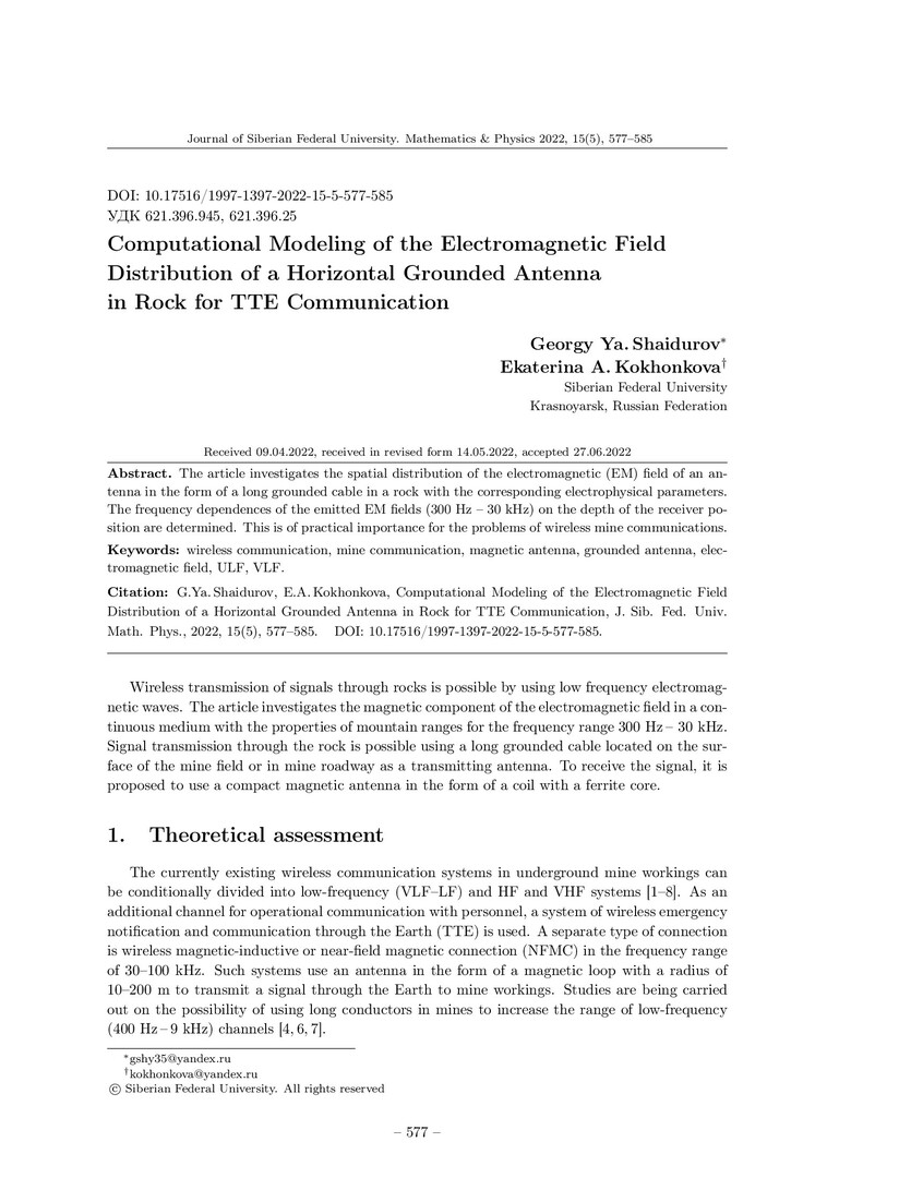 Библиографическое описание:Shaidurov, Georgy. Computational Modeling of the Electromagnetic Field Distribution of a Horizontal Grounded Antenna in Rock for TTE Communication = Вычислительное моделирование распределения электромагнитного поля горизонтальной заземленной антенны в горной породе / Georgy Ya. Shaidurov, E. A. Kokhonkova. - Текст : непосредственный // Журнал Сибирского федерального университета. Математика и физика. - 2022. - Т. 15, № 5. - С. 577-585. - Библиогр.: с. 584-585. - ISSN 1997-1397.