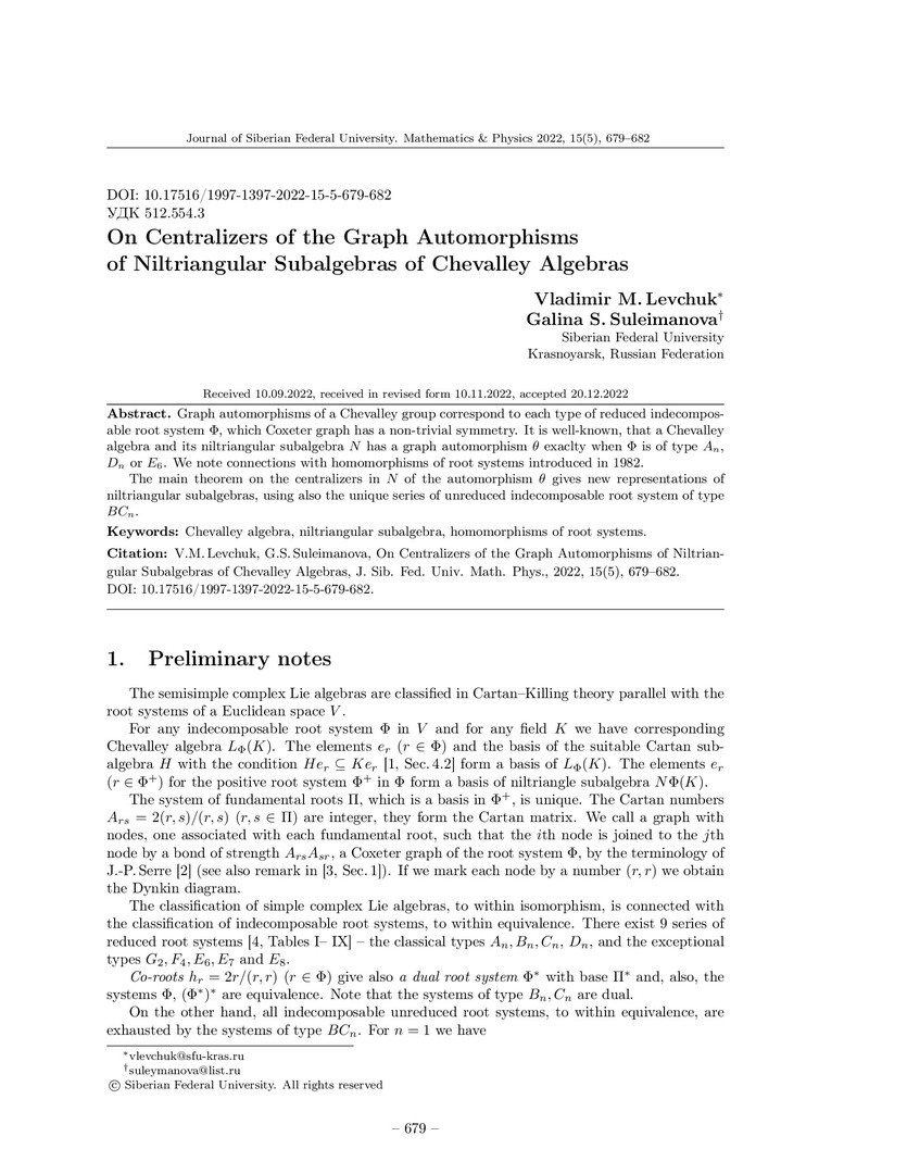 Библиографическое описание:Levchuk, Vladimir. On Centralizers of the Graph Automorphisms of Niltriangular Subalgebras of Chevalley Algebras = О централизаторах графовых автоморфизмов нильтреугольных подалгебр алгебр Шевалле / V. M. Levchuk, G. S. Suleimanova. - Текст : непосредственный // Журнал Сибирского федерального университета. Математика и физика. - 2022. - Т. 15, № 5. - С. 679-682. - Библиогр.: с. 682. - ISSN 1997-1397.
