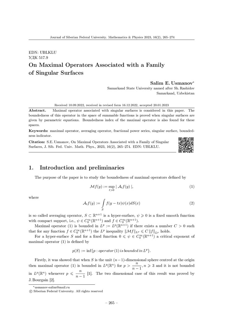 Библиографическое описание:Usmanov, Salim. On Maximal Operators Associated with a Family of Singular Surfaces = О максимальных операторах, ассоциированных с семейством сингулярных поверхностей / S. E. Usmanov. - Текст : непосредственный // Журнал Сибирского федерального университета. Математика и физика. - 2023. - Т. 16, № 2. - С. 265-274. - Библиогр.: с. 272-274. - ISSN 1997-1397.