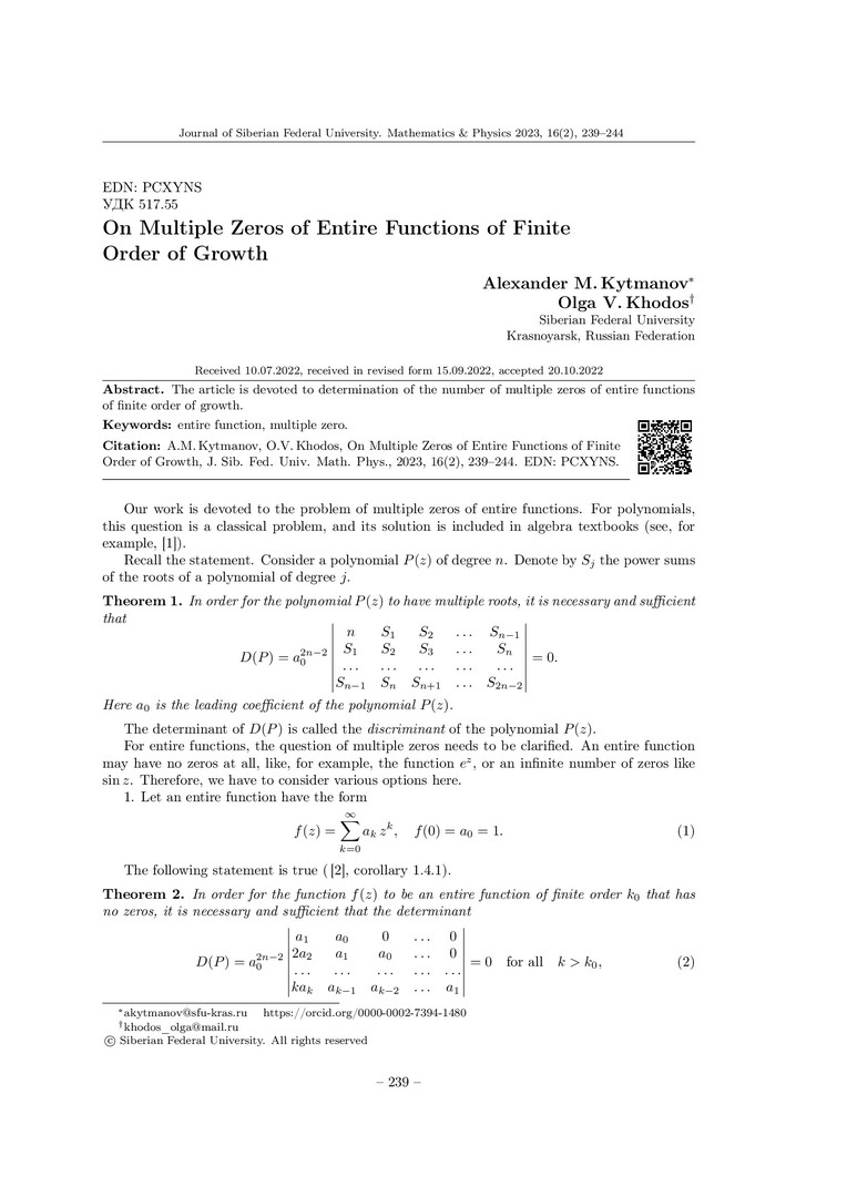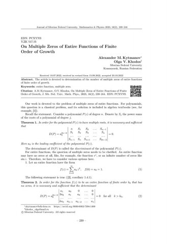 Библиографическое описание:Kytmanov, Alexander. On Multiple Zeros of Entire Functions of Finite Order of Growth = Кратные нули целых функций конечного порядка роста / A. M. Kytmanov, O. V. Khodos. - Текст : непосредственный // Журнал Сибирского федерального университета. Математика и физика. - 2023. - Т. 16, № 2. - С. 239-244. - Библиогр.: с. 244. - ISSN 1997-1397.