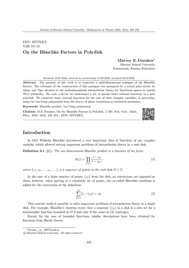 Библиографическое описание:Durakov, Matvey. On the Blaschke Factors in Polydisk = О множителях Бляшке в полидиске / M. E. Durakov. - Текст : непосредственный // Журнал Сибирского федерального университета. Математика и физика. - 2023. - Т. 16, № 2. - С. 245-252. - Библиогр.: с. 251-252. - ISSN 1997-1397.