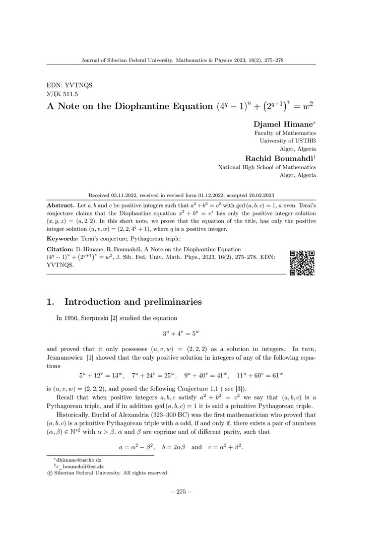 Аннотация:В этой короткой заметке мы доказываем, что уравнение заголовка имеет только положительное целочисленное решение (u; v;w) = (2; 2; 4q + 1), где q положительное целое число.