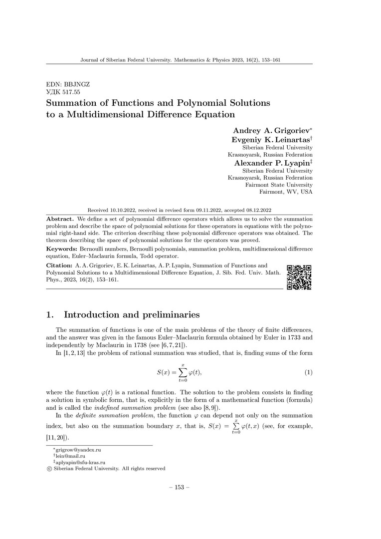 Библиографическое описание:Grigoriev, Andrey. Summation of Functions and Polynomial Solutions to a Multidimensional Difference Equation = Сумма функций и полиномиальные решения многомерного разностного уравнения / A. A. Grigoriev, E. K. Leinartas, A. P. Lyapin. - Текст : непосредственный // Журнал Сибирского федерального университета. Математика и физика. - 2023. - Т. 16, № 2. - С. 153-161. - Библиогр.: с. 159-161 . - ISSN 1997-1397.