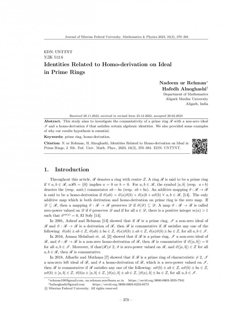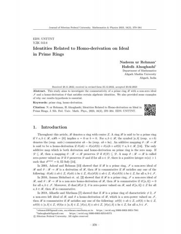 Библиографическое описание:Nadeem ur Rehman. Identities Related to Homo-derivation on Ideal in Prime Rings = Тождества, связанные с гомообразованием на идеале в первичных кольцах / Nadeem ur Rehman, Hafedh Alnoghashi. - Текст : непосредственный // Журнал Сибирского федерального университета. Математика и физика. - 2023. - Т. 16, № 3. - С. 371-385. - Библиогр.: с. 382-385. - ISSN 1997-1397.