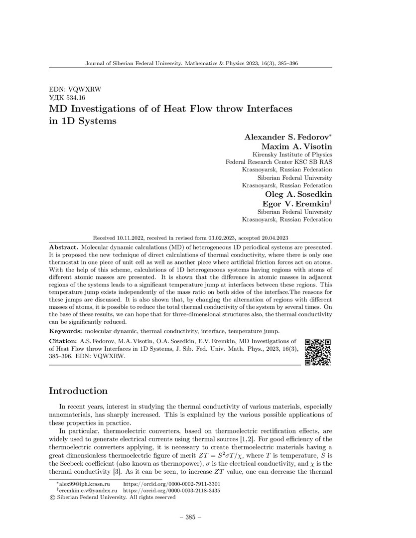 Библиографическое описание:MD Investigations of of Heat Flow throw Interfaces in 1D Systems = МД исследования границ раздела теплового потока в одномерных системах / A. S. Fedorov, M. A. Visotin, O. A. Sosedkin, E. V. Eremkin. - Текст : непосредственный // Журнал Сибирского федерального университета. Математика и физика. - 2023. - Т. 16, № 3. - С. 386-397. - Библиогр.: с. 394-397. - ISSN 1997-1397.