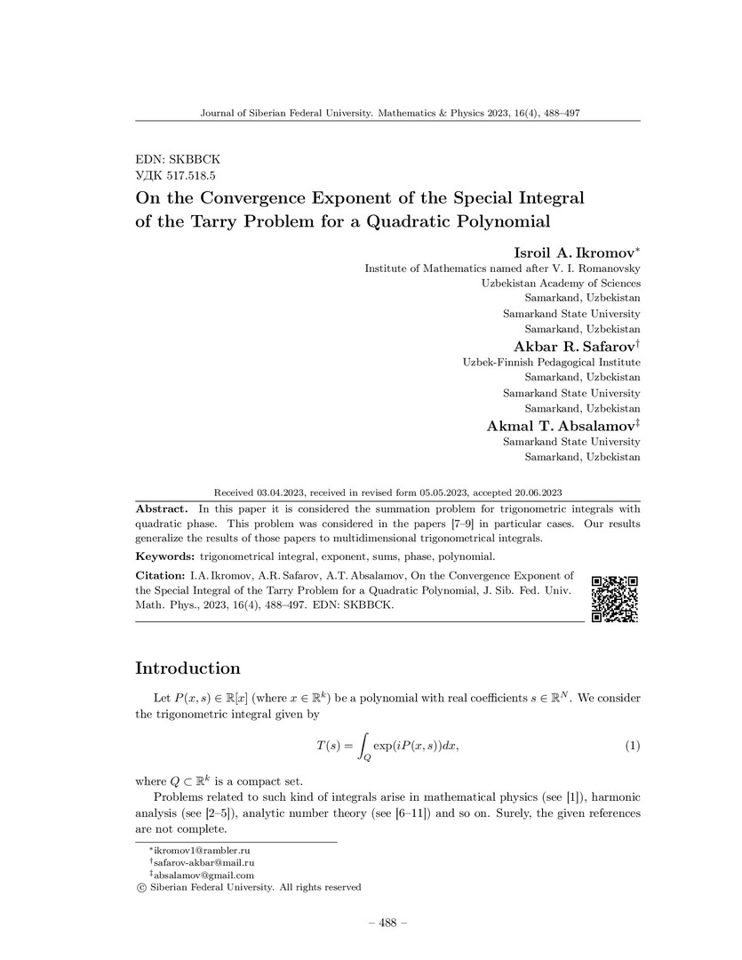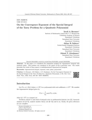 Библиографическое описание:Ikromov, Isroil. On the Convergence Exponent of the Special Integral of the Tarry Problem for a Quadratic Polynomial = О показателях сходимости особого интеграла проблемы Терри для квадратичного многочлена / I. A. Ikromov, A. R. Safarov, A. T. Absalamov. - Текст : непосредственный // Журнал Сибирского федерального университета. Математика и физика. - 2023. - Т. 16, № 4. - С. 488-497. - Библиогр.: с. 496-497. - ISSN 1997-1397.