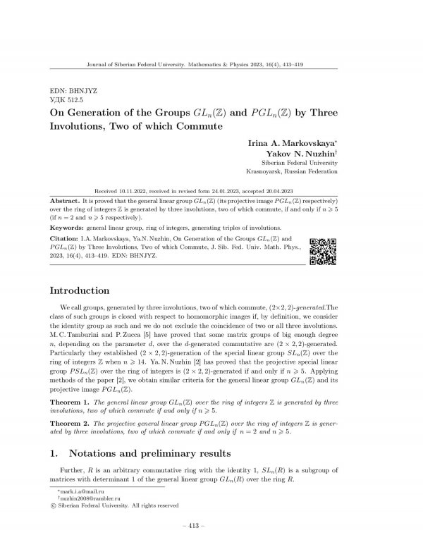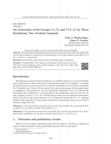Библиографическое описание:Markovskaya, Irina. On Generation of the Groups GLn(Z) and PGLn(Z) by Three Involutions, Two of which Commute = О порождаемости групп GLn(Z) и PGLn(Z) тремя инволюциями, две из которых перестановочны / I. A. Markovskaya, Y. N. Nuzhin. - Текст : непосредственный // Журнал Сибирского федерального университета. Математика и физика. - 2023. - Т. 16, № 4. - С. 413-419. - Библиогр.: с. 419. - ISSN 1997-1397.