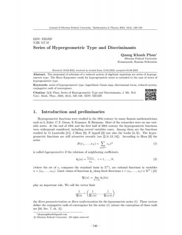 Библиографическое описание:Quang Khanh Phan. Series of Hypergeometric Type and Discriminants = Ряды гипергеометрического типа и дискриминанты / Quang Khanh Phan. - Текст : непосредственный // Журнал Сибирского федерального университета. Математика и физика. - 2023. - Т. 16, № 4. - С. 540-548. - Библиогр.: с. 547-548. - ISSN 1997-1397.