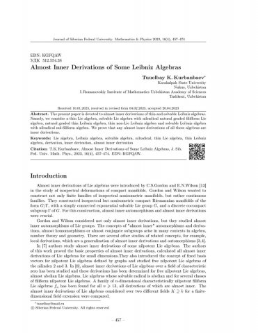 Библиографическое описание:Kurbanbaev, Tuuelbay. Almost Inner Derivations of Some Leibniz Algebras = Почти внутренние дифференцирования некоторых алгебр Лейбница / T. K. Kurbanbaev. - Текст : непосредственный // Журнал Сибирского федерального университета. Математика и физика. - 2023. - Т. 16, № 4. - С. 457-474. - Библиогр.: с. 473-474. - ISSN 1997-1397.