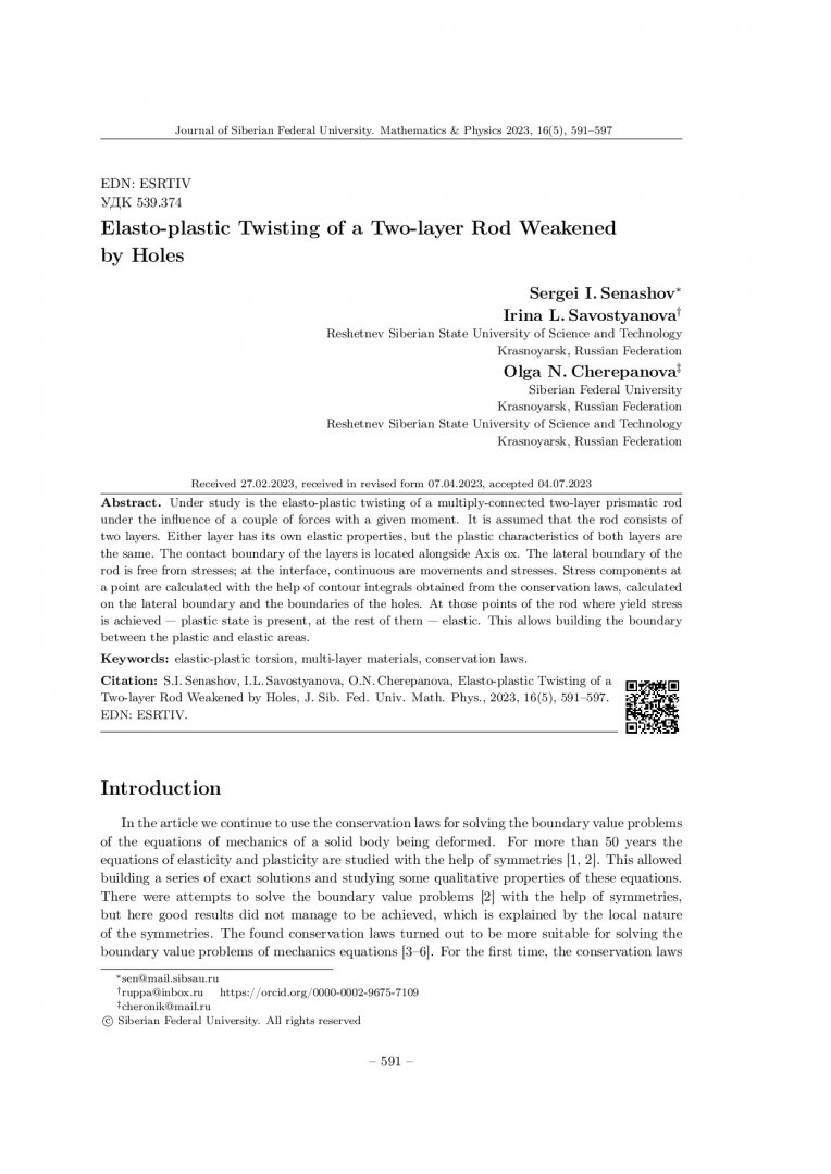 Библиографическое описание:Senashov, Sergei. Elasto-plastic Twisting of a Two-layer Rod Weakened by Holes = Упруго-пластическое кручение двухслойного стержня, ослабленного отверстиями / S. I. Senashov, I. L. Savostyanova, O. N. Cherepanova. - Текст : непосредственный // Журнал Сибирского федерального университета. Математика и физика. - 2023. - Т. 16, № 5. - С. 591-597. - Библиогр.: с. 596-597. - ISSN 1997-1397.