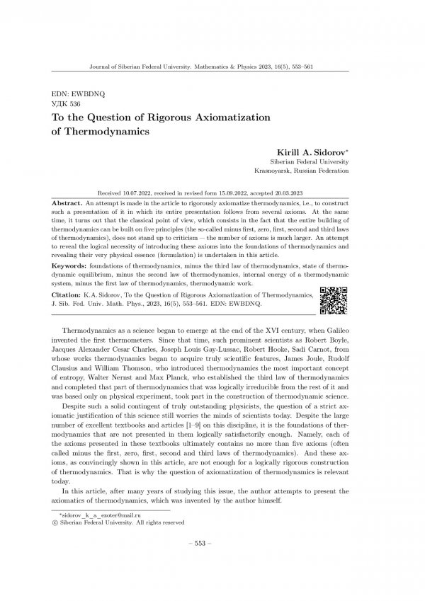 Библиографическое описание:Sidorov, Kirill. To the Question of Rigorous Axiomatization of Thermodynamics = К вопросу о строгой аксиоматизации термодинамики / K. A. Sidorov. - Текст : непосредственный // Журнал Сибирского федерального университета. Математика и физика. - 2023. - Т. 16, № 5. - С. 553-561. - Библиогр.: с. 561. - ISSN 1997-1397.