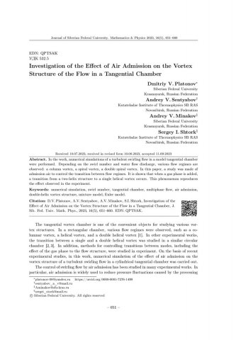 Библиографическое описание:Investigation of the Effect of Air Admission on the Vortex Structure of the Flow in a Tangential Chamber = Исследование влияния подачи воздуха на вихревую структуру течения в тангенциальной камере / D. V. Platonov, A. V. Sentyabov, A. V. Minakov, S. I. Shtork. - Текст : непосредственный // Журнал Сибирского федерального университета. Математика и физика. - 2023. - Т. 16, № 5. - С. 651-660. - Библиогр.: с. 659-660. - ISSN 1997-1397.