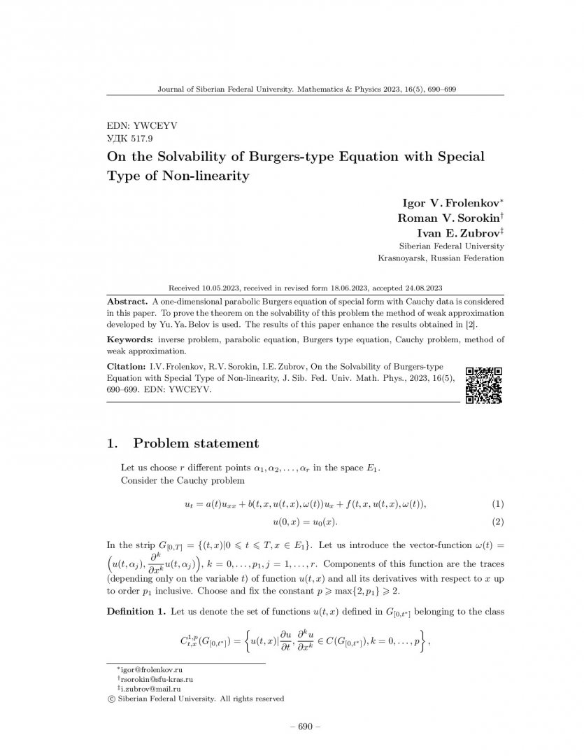 Библиографическое описание:Frolenkov, Igor. On the Solvability of a Burgers-type Equation with a Specia Type of Nonlinearity = О разрешимости уравнения типа Бюргерса с нелинейностью специального вида / I. V. Frolenkov, R. V. Sorokin, I. E. Zubrov. - Текст : непосредственный // Журнал Сибирского федерального университета. Математика и физика. - 2023. - Т. 16, № 5. - С. 690-699. - Библиогр.: с. 699. - ISSN 1997-1397.