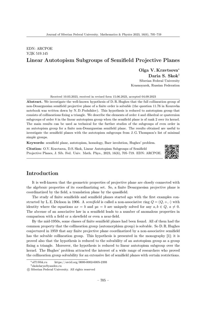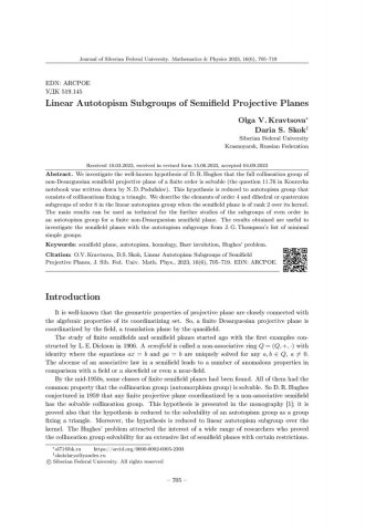 Библиографическое описание:Kravtsova, Olga. Linear Autotopism Subgroups of Semifield Projective Planes = Подгруппы линейных автотопизмов полуполевых проективных плоскостей / O. V. Kravtsova, D. S. Skok. - Текст : непосредственный // Журнал Сибирского федерального университета. Математика и физика. - 2023. - Т. 16, № 6. - С. 705-719. - Библиогр.: с. 718-719. - ISSN 1997-1397.