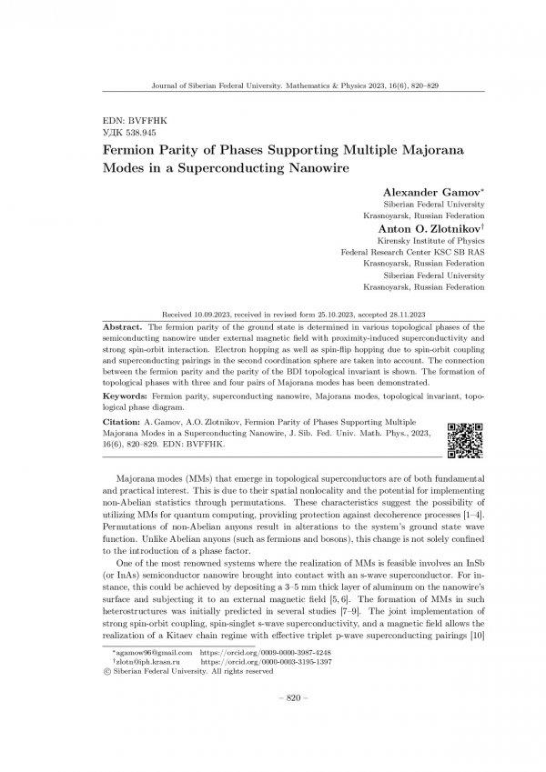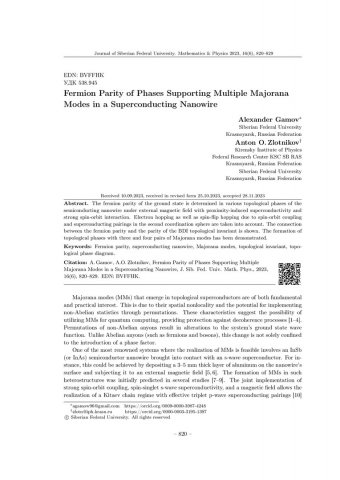 Библиографическое описание:Gamov, Alexander. Fermion Parity of Phases Supporting Multiple Majorana Modes in a Superconducting Nanowire = Фермионная четность в фазах с множеством майорановских мод в сверхпроводящей нанопроволоке / Alexander Gamov, A. O. Zlotnikov. - Текст : непосредственный // Журнал Сибирского федерального университета. Математика и физика. - 2023. - Т. 16, № 6. - С. 820-829. - Библиогр.: с. 827-829. - ISSN 1997-1397.