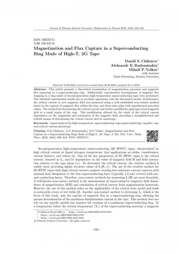 Библиографическое описание:Chikurov, Daniil. Magnetization and Flux Capture in a Superconducting Ring Made of High-Tc 2G Tape = Намагниченность и захват потока в кольце из высокотемпературной сверхпроводящей ленты второго поколения / D. S. Chikurov, A. E. Rudominskiy, M. P. Volkov. - Текст : непосредственный // Журнал Сибирского федерального университета. Математика и физика. - 2023. - Т. 16, № 6. - С. 838-844. - Библиогр.: с. 843-844. - ISSN 1997-1397.