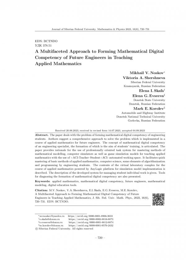 Библиографическое описание:A Multifaceted Approach to Forming Mathematical Digital Competency of Future Engineers in Teaching Applied Mathematics = Комплексный подход к формированию математической цифровой компетентности будущих инженеров в обучении прикладной математике / M. V. Noskov, V. A. Shershneva, E. I. Skafa [et al.]. - Текст : непосредственный // Журнал Сибирского федерального университета. Математика и физика. - 2023. - Т. 16, № 6. - С. 720-731. - Библиогр.: с. 729-731. - ISSN 1997-1397.