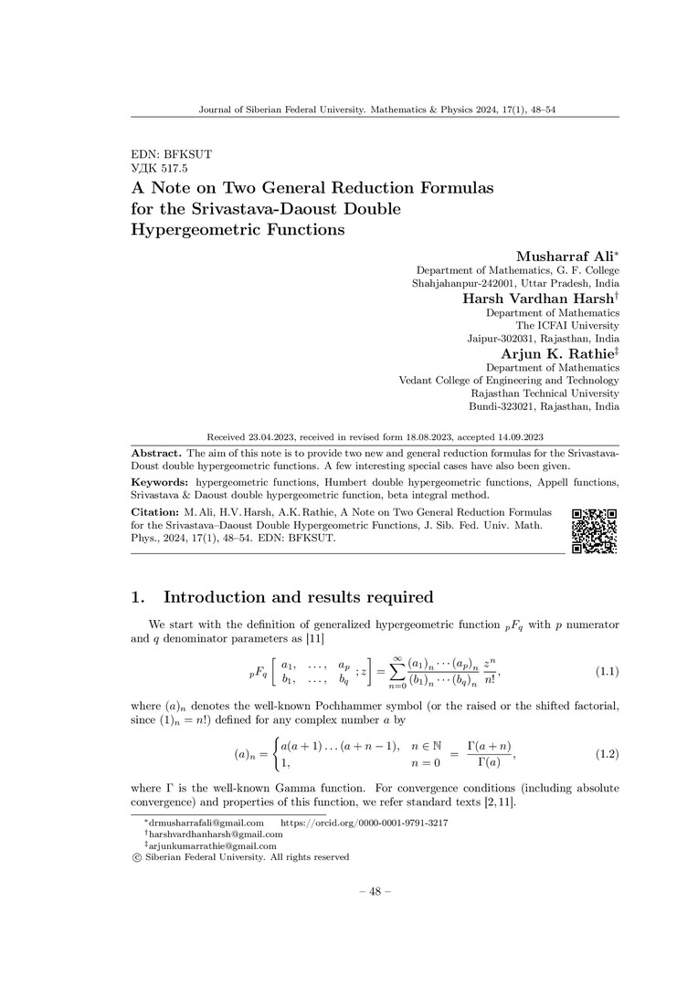 Библиографическое описание:Musharraf Ali. A Note on Two General Reduction Formulas for the Srivastava-Daoust Double Hypergeometric Functions = Замечание о двух общих формулах приведения для двойных гипергеометрических функций Шриваставы-Дауста / Musharraf Ali, Harsh Vardhan Harsh, Arjun K. Rathie. - Текст : непосредственный // Журнал Сибирского федерального университета. Математика и физика. - 2024. - Т. 17, № 1. - С. 48-54. - Библиогр.: с. 53-54. - ISSN 1997-1397.